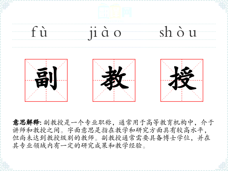 副教授是一个专业职称,通常用于高等教育机构中,介于讲师和教授之间。字面意思是指在教学和研究方面具有较高水平,但尚未达到教授级别的教师。副教授通常需要具备博士学位,并在其专业领域内有一定的研究成果和教学经验。