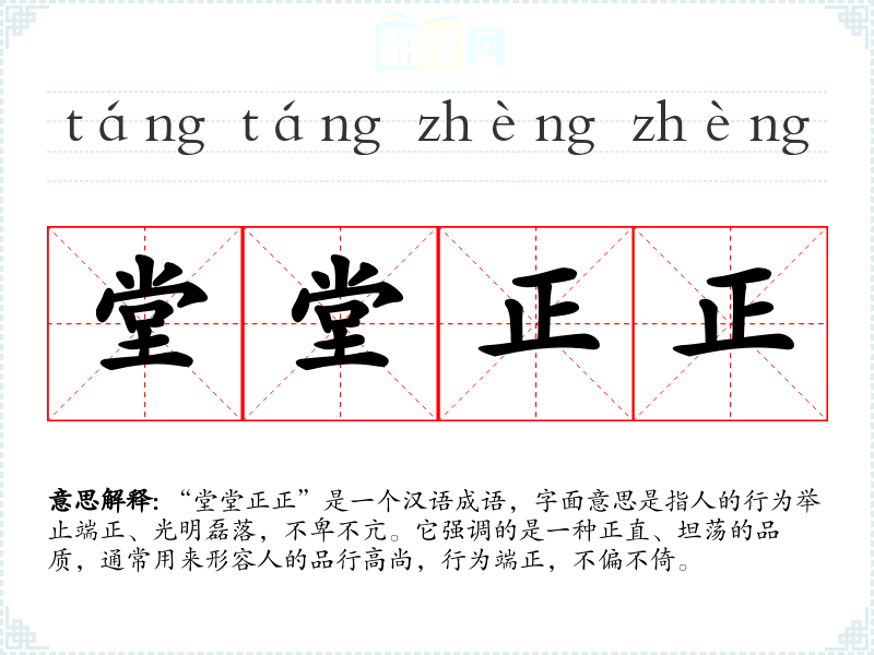 “堂堂正正”是一个汉语成语,字面意思是指人的行为举止端正、光明磊落,不卑不亢。它强调的是一种正直、坦荡的品质,通常用来形容人的品行高尚,行为端正,不偏不倚。