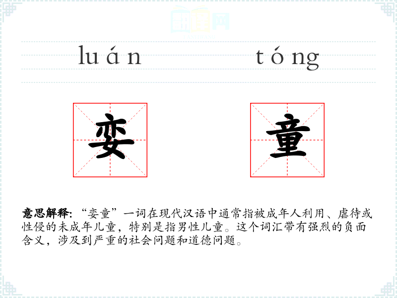“娈童”一词在现代汉语中通常指被成年人利用、虐待或性侵的未成年儿童,特别是指男性儿童。这个词汇带有强烈的负面含义,涉及到严重的社会问题和道德问题。