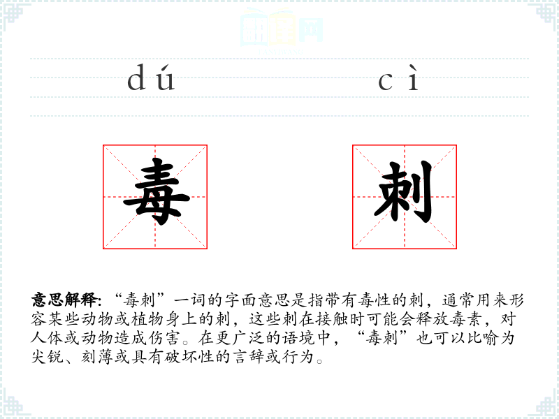 “毒刺”一词的字面意思是指带有毒性的刺,通常用来形容某些动物或植物身上的刺,这些刺在接触时可能会释放毒素,对人体或动物造成伤害。在更广泛的语境中,“毒刺”也可以比喻为尖锐、刻*或具有破坏性的言辞或行为。