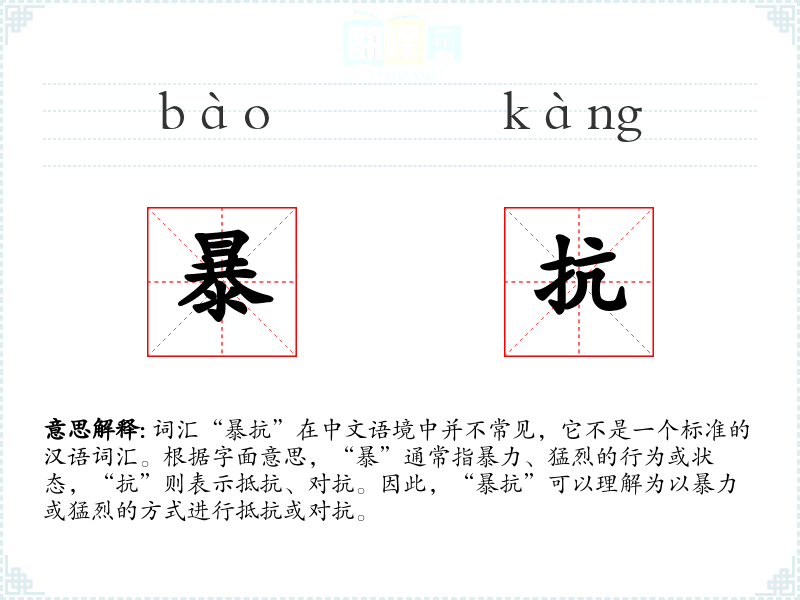 词汇“暴抗”在中文语境中并不常见,它不是一个标准的汉语词汇。根据字面意思,“暴”通常指暴力、猛烈的行为或状态,“抗”则表示抵抗、对抗。因此,“暴抗”可以理解为以暴力或猛烈的方式进行抵抗或对抗。