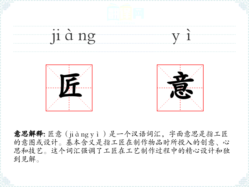 匠意(jiàng yì)是一个汉语词汇,字面意思是指工匠的意图或设计。基本含义是指工匠在制作物品时所投入的创意、心思和技艺。这个词汇强调了工匠在工艺制作过程中的精心设计和独到见解。