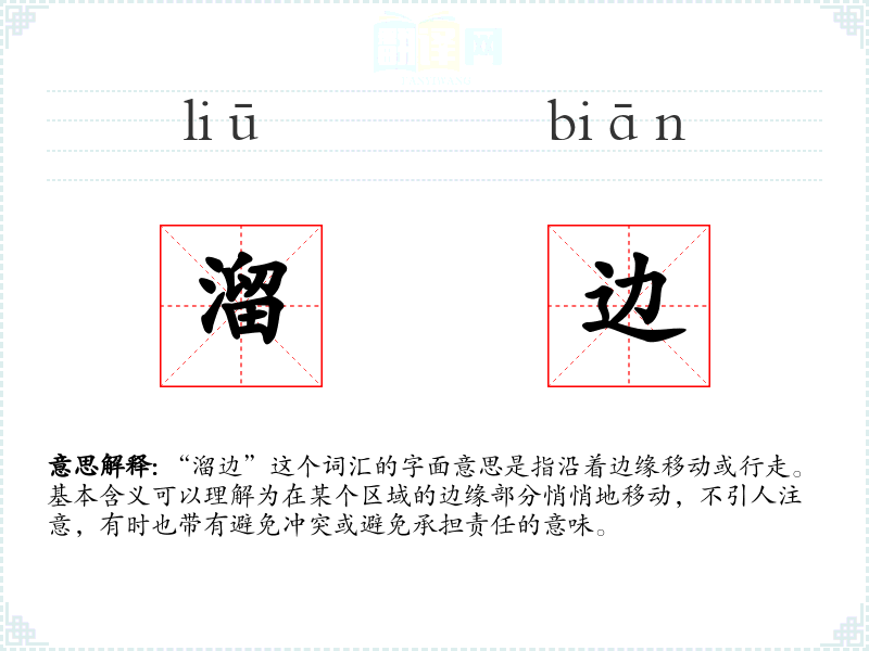 - 口语:在日常对话中,这个词常用来描述某人避免参与某事或避免承担责任的行为,如“他开会时总是溜边,从不发表意见。”