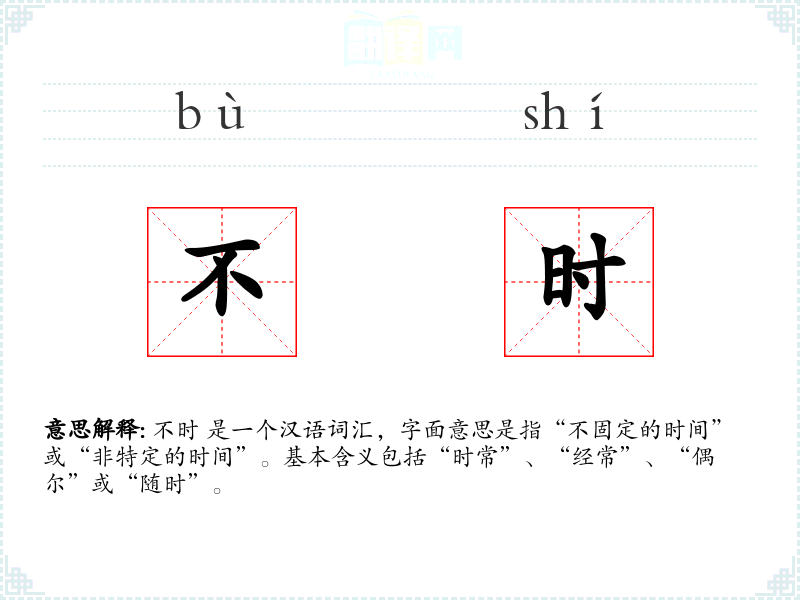 不时 是一个汉语词汇,字面意思是指“不固定的时间”或“非特定的时间”。基本含义包括“时常”、“经常”、“偶尔”或“随时”。