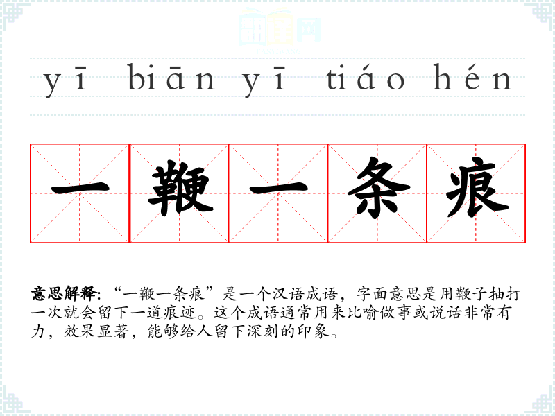 “一鞭一条痕”是一个汉语成语,字面意思是用鞭子抽打一次就会留下一道痕迹。这个成语通常用来比喻做事或说话非常有力,效果显著,能够给人留下深刻的印象。