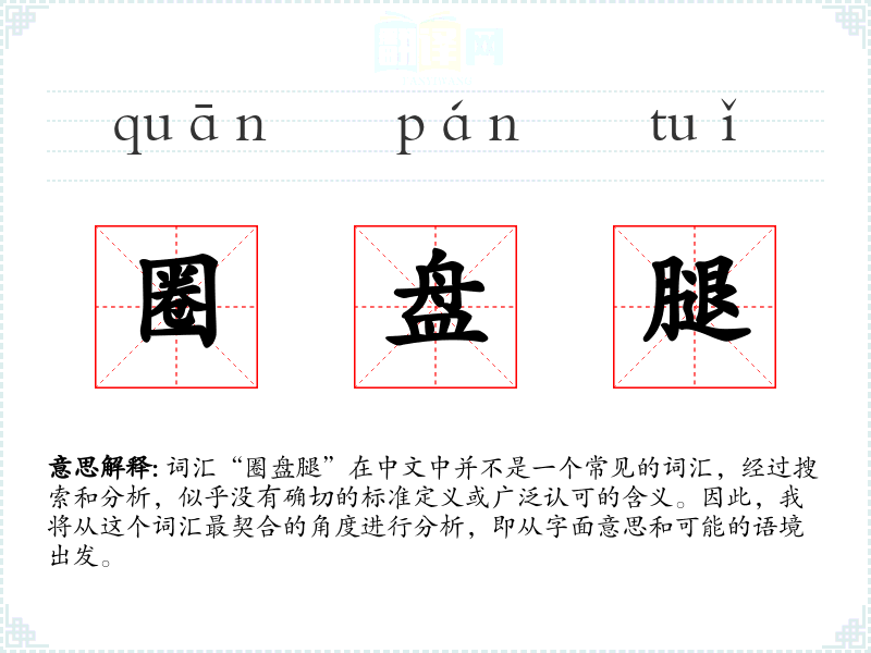 由于“圈盘腿”不是一个标准词汇,它在不同语境下的使用可能非常有限。如果存在使用,可能是在描述某种特定的坐姿,或者在某些特定的文化或社群中有所指代。