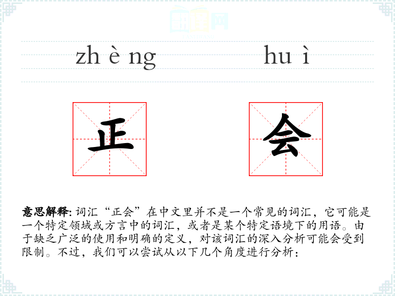 “正会”这一词汇的分析受到其不常见和定义不明确的影响。在语言学*和表达中,了解和使用常见且定义明确的词汇更为重要。如果“正会”是一个特定领域或方言中的词汇,了解其具体语境和用法将有助于更好地理解和使用它。