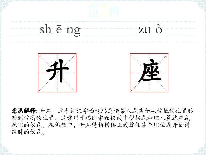 升座:这个词汇字面意思是指某人或某物从较低的位置移动到较高的位置,通常用于描述仪式中僧侣或神职人员就座或就职的仪式。在中,升座特指僧侣正式就任某个职位或开始讲经时的仪式。
