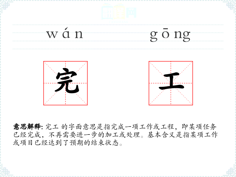 “完工”一词由“完”和“工”两个字组成。“完”字古汉语中意为完整、完成,“工”字则指工作、工程。随着时间的推移,“完工”逐渐成为描述工作或工程结束的常用词汇。