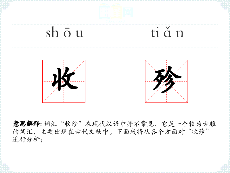 词汇“收殄”在现代汉语中并不常见,它是一个较为古雅的词汇,主要出现在古代文献中。下面我将从各个方面对“收殄”进行分析: