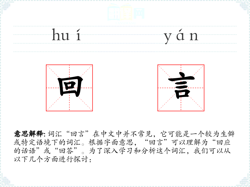 “回言”是一个强调回应和回答的词汇,它在特定的语境和场合中可能更为适用。在语言学习和表达中,了解和掌握这样的词汇可以帮助我们更精确地表达思想和情感。