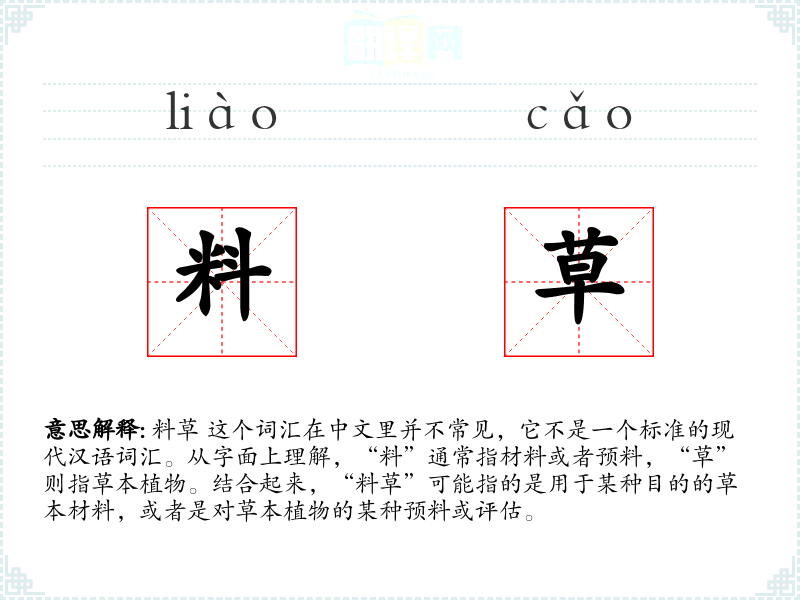 - 反义词:(由于“料草”不是一个常用词汇,反义词不明确)