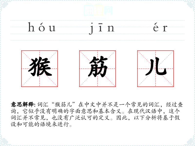 由于“猴筋儿”不是一个标准词汇,我们无法提供一个确切的基本定义。它可能是某个方言中的词汇,或者是某个特定社群中的俚语。