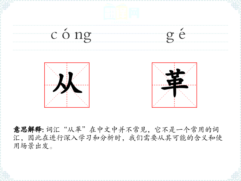 词汇“从革”在中文中并不常见,它不是一个常用的词汇,因此在进行深入学习和分析时,我们需要从其可能的含义和使用场景出发。