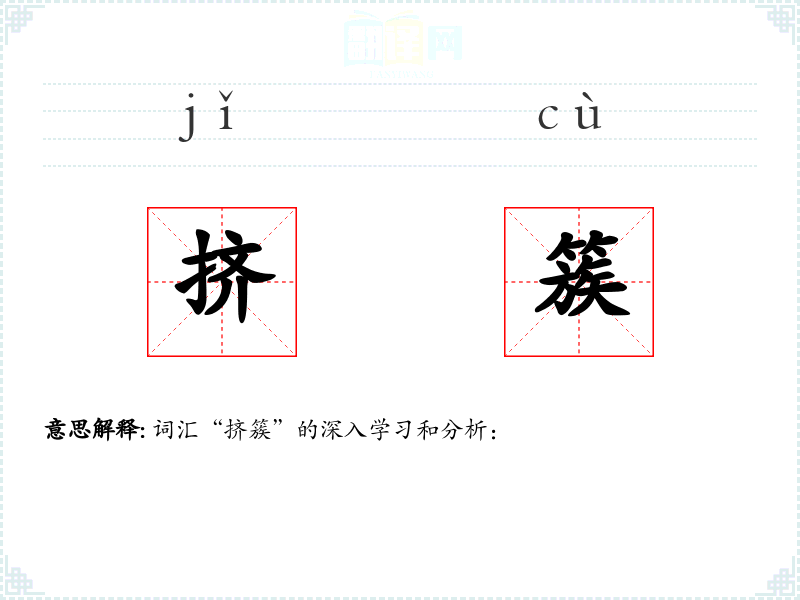 “挤簇”由“挤”和“簇”两个字组成。“挤”字古已有之,意为用力推或压。“簇”字原指小竹丛,引申为聚集。两个字组合后,形成了描述紧密聚集的状态。