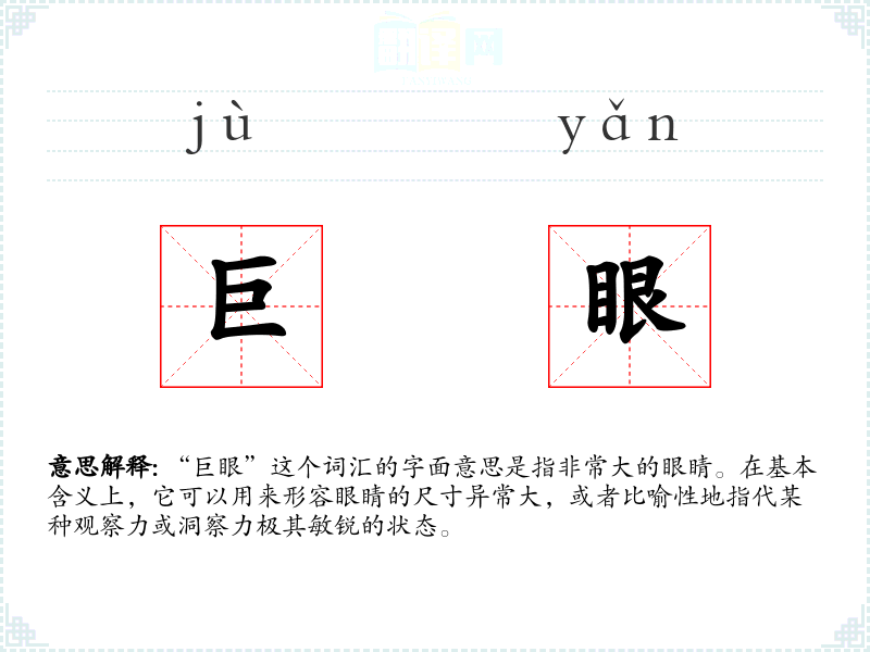 “巨眼”这个词汇在中文中直接由“巨”和“眼”两个字组成,没有复杂的词源故事。在语言的演变中,它主要用于形容和比喻,随着文化和语言的发展,其使用范围和含义也在不断扩展。