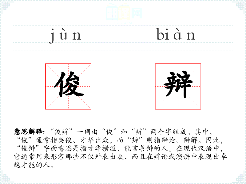- 文学语境:在文学作品中,“俊辩”常用来形容主角或重要人物,如历史小说中的政治家、律师或学者,他们通过出色的辩论技巧影响剧情发展。