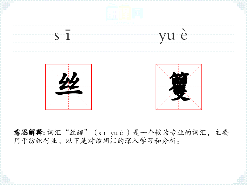 词汇“丝繀”(sī yuè)是一个较为专业的词汇,主要用于纺织行业。以下是对该词汇的深入学*和分析: