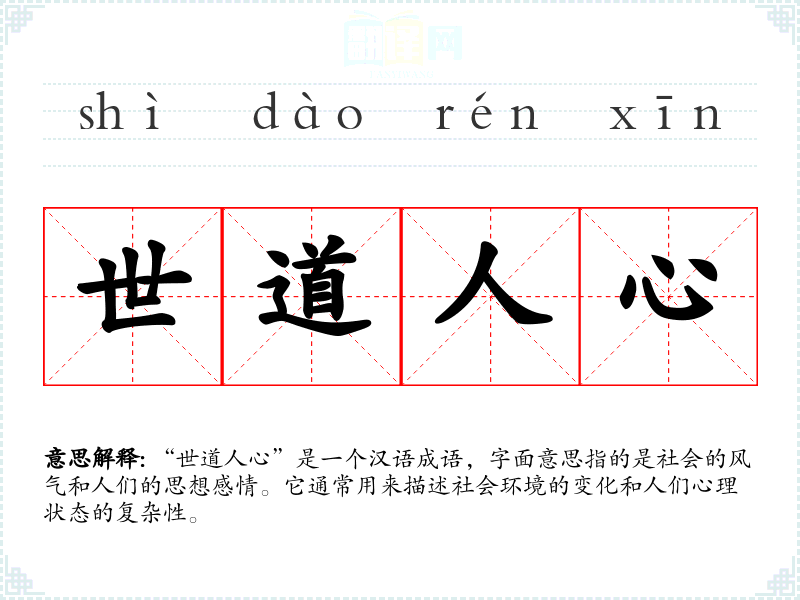 “世道人心”是一个汉语成语,字面意思指的是社会的风气和人们的思想感情。它通常用来描述社会环境的变化和人们心理状态的复杂性。