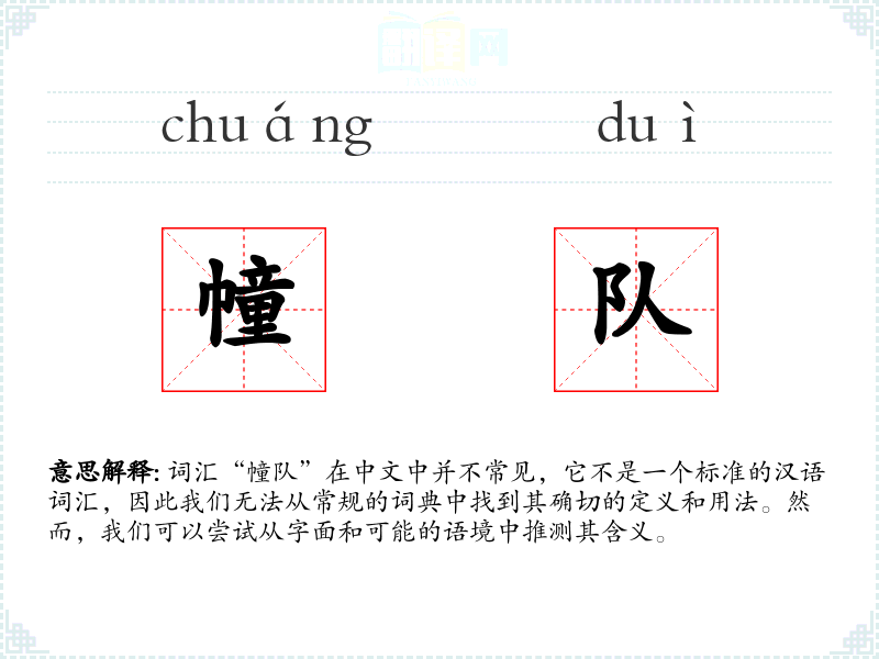 词汇“幢队”在中文中并不常见,它不是一个标准的汉语词汇,因此我们无法从常规的词典中找到其确切的定义和用法。然而,我们可以尝试从字面和可能的语境中推测其含义。