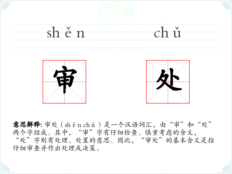 审处(shěn chǔ)是一个汉语词汇,由“审”和“处”两个字组成。其中,“审”字有仔细检查、慎重考虑的含义,“处”字则有处理、处置的意思。因此,“审处”的基本含义是指仔细审查并作出处理或决策。