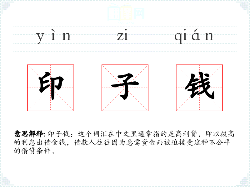 印子钱:这个词汇在中文里通常指的是高利贷,即以极高的利息出借金钱,借款人往往因为急需资金而被迫接受这种不公平的借贷条件。