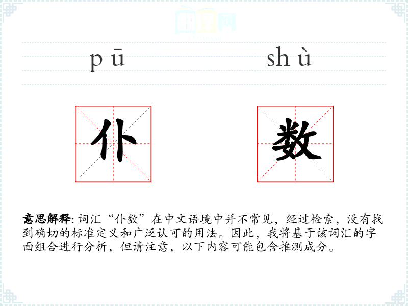 词汇“仆数”在中文语境中并不常见,经过检索,没有找到确切的标准定义和广泛认可的用法。因此,我将基于该词汇的字面组合进行分析,但请注意,以下内容可能包含推测成分。