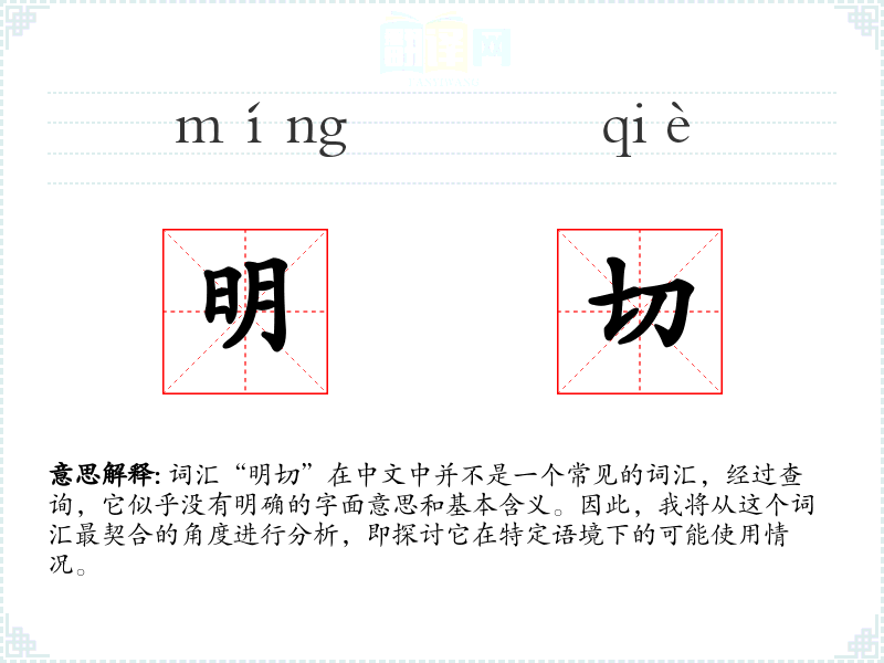 由于“明切”不是一个标准词汇,我们无法给出一个确切的基本定义。它可能是由两个汉字“明”和“切”组合而成的,但这种组合在标准汉语中并不常见。