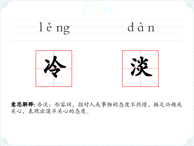 冷淡:形容词,指对人或事物的态度不热情,缺乏兴趣或关心,表现出漠不关心的态度。