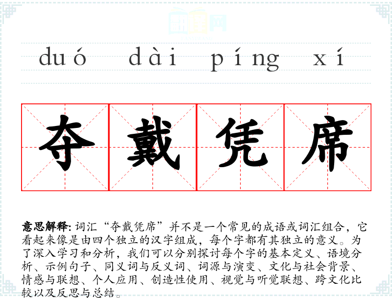 通过对“夺戴凭席”这四个字的分析,我们可以看到每个字都有其独特的意义和用法,它们在不同的语境和文化背景中扮演着重要的角色。在语言学*和表达中,理解和运用这些词汇可以帮助我们更准确地传达思想和情感。