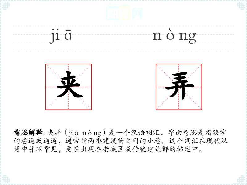 夹弄(jiā nòng)是一个汉语词汇,字面意思是指狭窄的巷道或通道,通常指两排建筑物之间的小巷。这个词汇在现代汉语中并不常见,更多出现在老城区或传统建筑群的描述中。