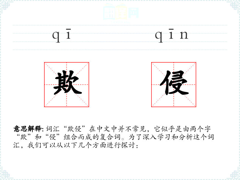 词汇“欺侵”在中文中并不常见,它似乎是由两个字“欺”和“侵”组合而成的复合词。为了深入学*和分析这个词汇,我们可以从以下几个方面进行探讨: