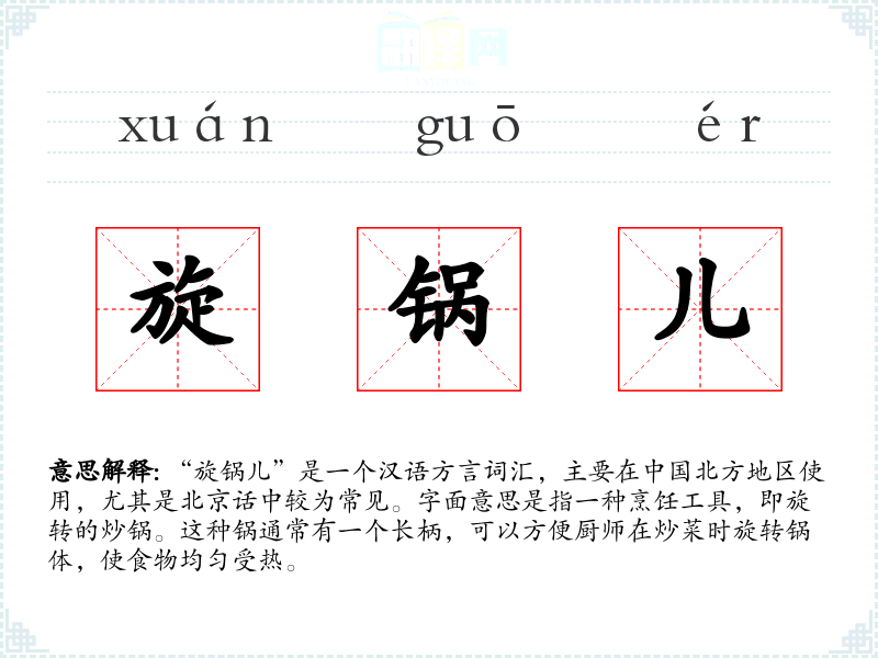 同义词:旋转炒锅、转锅、旋炒锅 反义词:平底锅、炖锅(这些与旋锅儿在功能和形状上有所不同)