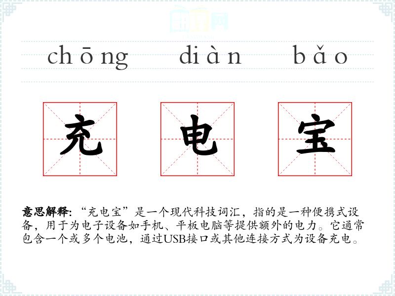 “充电宝”是一个现代科技词汇,指的是一种便携式设备,用于为电子设备如手机、平板电脑等提供额外的电力。它通常包含一个或多个电池,通过USB接口或其他连接方式为设备充电。