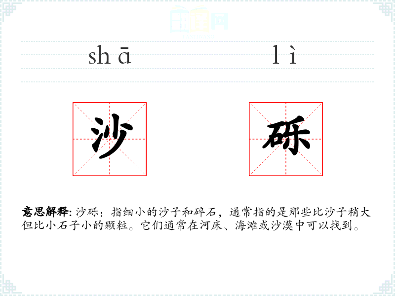 沙砾:指细小的沙子和碎石,通常指的是那些比沙子稍大但比小石子小的颗粒。它们通常在河床、海滩或沙漠中可以找到。
