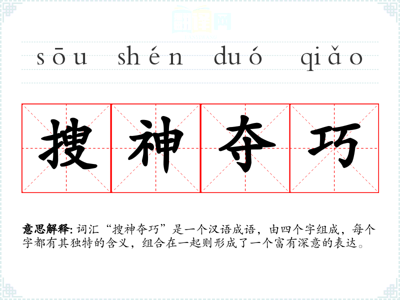 词汇“搜神夺巧”是一个汉语成语,由四个字组成,每个字都有其独特的含义,组合在一起则形成了一个富有深意的表达。