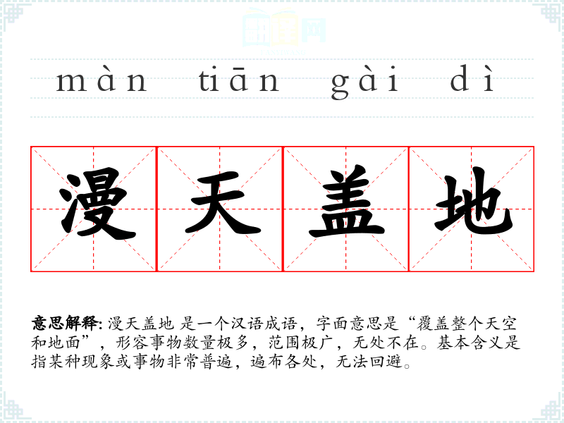 漫天盖地 是一个汉语成语,字面意思是“覆盖整个天空和地面”,形容事物数量极多,范围极广,无处不在。基本含义是指某种现象或事物非常普遍,遍布各处,无法回避。