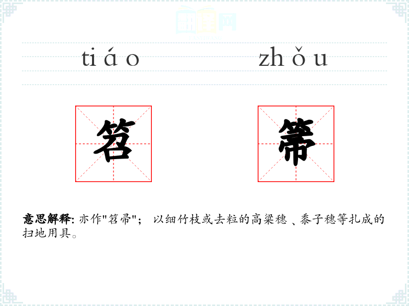 亦作"笤帚"; 以细竹枝或去粒的高粱穗﹑黍子穗等扎成的扫地用具。
