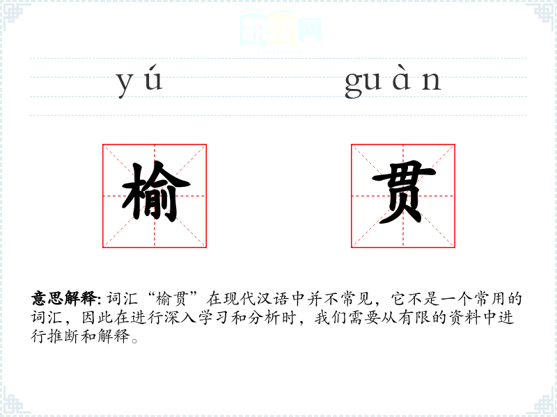 词汇“榆贯”在现代汉语中并不常见,它不是一个常用的词汇,因此在进行深入学*和分析时,我们需要从有限的资料中进行推断和解释。