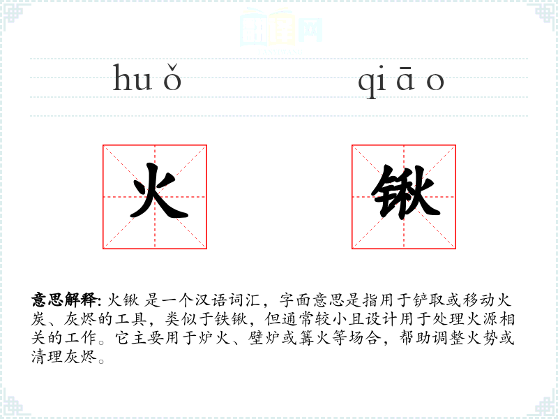 火锹 是一个汉语词汇,字面意思是指用于铲取或移动火炭、灰烬的工具,类似于铁锹,但通常较小且设计用于处理火源相关的工作。它主要用于炉火、壁炉或篝火等场合,帮助调整火势或清理灰烬。