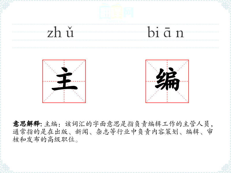 主编:该词汇的字面意思是指负责编辑工作的主管人员,通常指的是在出版、新闻、杂志等行业中负责内容策划、编辑、审核和发布的高级职位。