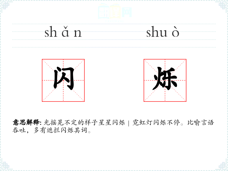 光摇晃不定的样子星星闪烁|霓虹灯闪烁不停。比喻言语吞吐,多有遮拦