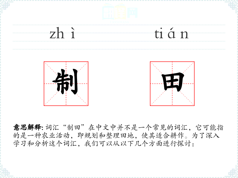 词汇“制田”在中文中并不是一个常见的词汇,它可能指的是一种农业活动,即规划和整理田地,使其适合耕作。为了深入学*和分析这个词汇,我们可以从以下几个方面进行探讨:
