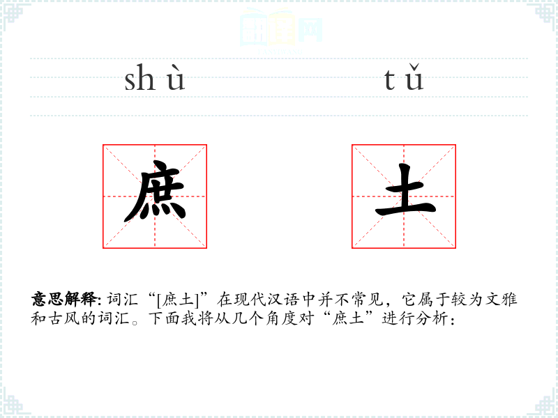词汇“[庶土]”在现代汉语中并不常见,它属于较为文雅和古风的词汇。下面我将从几个角度对“庶土”进行分析: