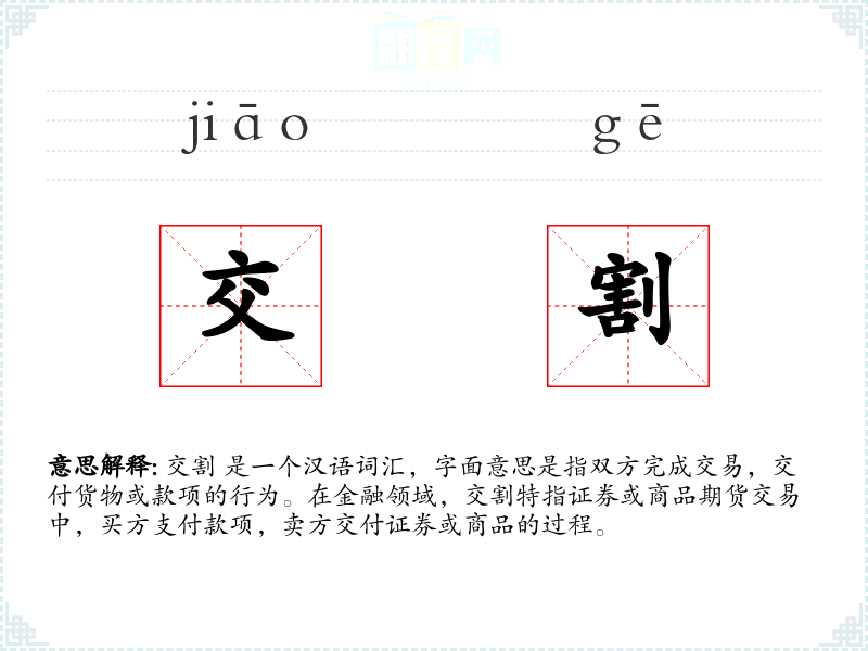 交割 的词源可以追溯到古代汉语,其中“交”意味着交换,“割”原指切割,后引申为分割、交付。随着时间的推移,这个词在金融领域得到了特定的含义。