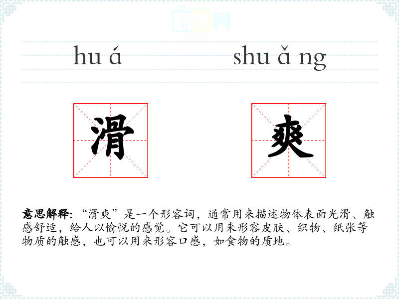 “滑爽”一词由“滑”和“爽”两个字组成。其中,“滑”字古已有之,意为光滑、滑溜;“爽”字则有清爽、舒适之意。两者结合,形成了描述触感愉悦的词汇。