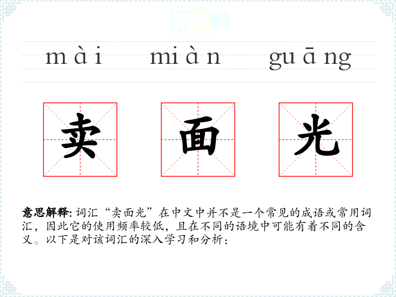 词汇“卖面光”在中文中并不是一个常见的成语或常用词汇,因此它的使用频率较低,且在不同的语境中可能有着不同的含义。以下是对该词汇的深入学*和分析: