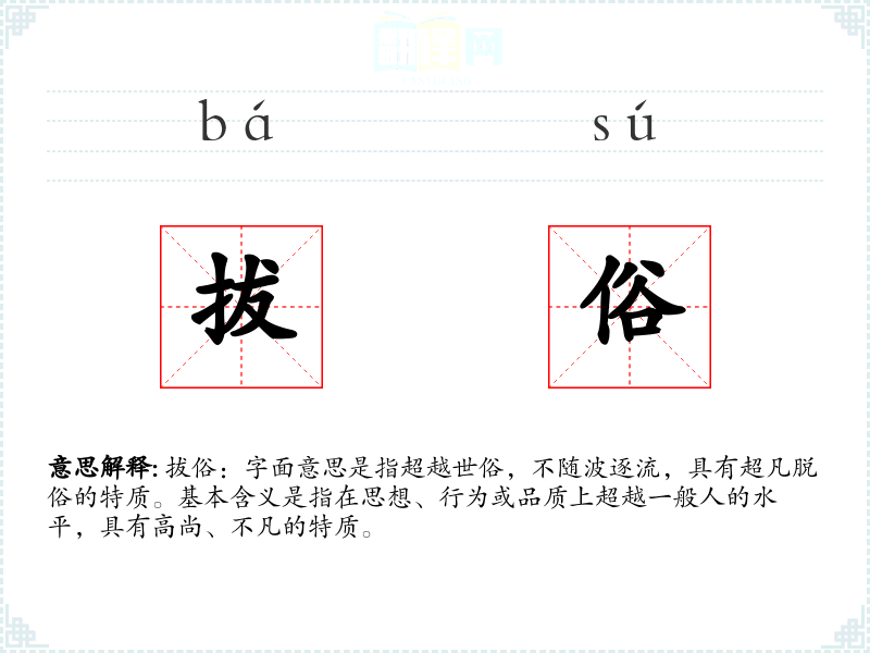 拔俗:字面意思是指超越世俗,不随波逐流,具有超凡脱俗的特质。基本含义是指在思想、行为或品质上超越一般人的水平,具有高尚、不凡的特质。