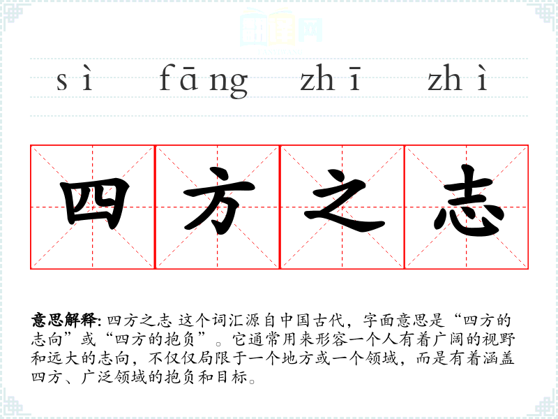 四方之志 这个词汇源自**古代,字面意思是“四方的志向”或“四方的抱负”。它通常用来形容一个人有着广阔的视野和远大的志向,不仅仅局限于一个地方或一个领域,而是有着涵盖四方、广泛领域的抱负和目标。