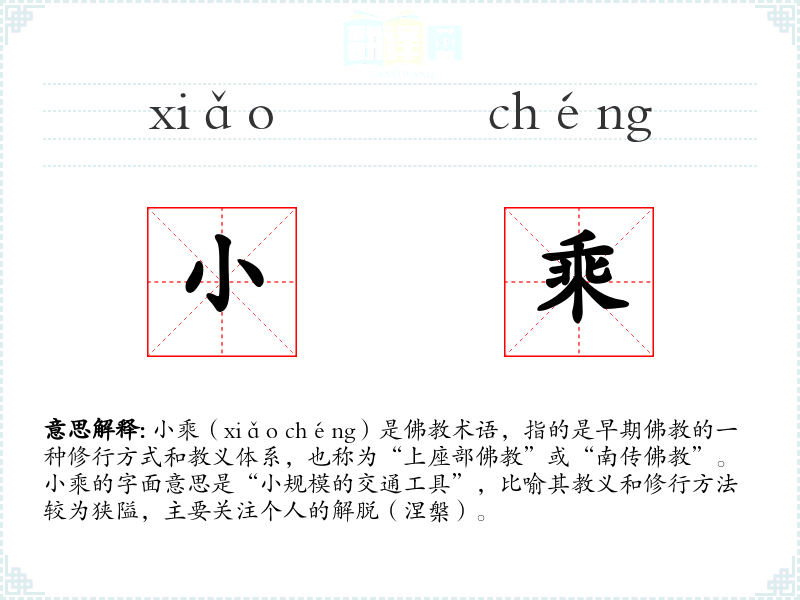 - 反义词:大乘**(强调普渡众生)